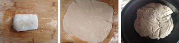 6、将饼子弄出皱纹,平底锅烧热刷油,铺上饼子,小火烙香。