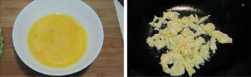 6、炒锅中放少许油,油温8成热时,倒入鸡蛋液,用筷子轻轻划散成块,然后盛出,待用。