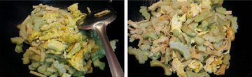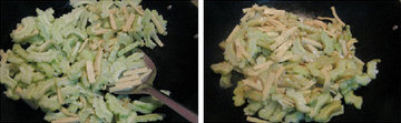 7、锅中倒少许油,将苦瓜片、豆腐丝一同入锅中翻炒。