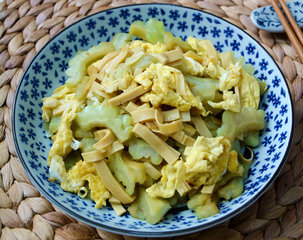 这道鸡蛋豆皮炒苦瓜的做法非常简单,营养也特别丰富。用苦瓜和芹菜、青椒、黄瓜、荔枝共同榨汁,味道苦中有甜,很是清热解暑。苦瓜具有清热祛暑、明目解毒、降压降糖、利尿凉血、解劳清心、益气解乏、益肾利尿之功效。可生吃,也可熟吃。