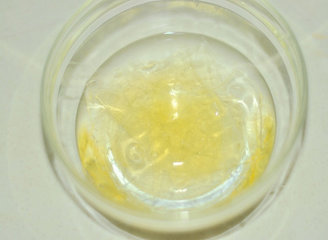 3、泡软的鱼胶片,加入和鱼胶片一齐的清水,隔水,小火加热至鱼胶片全部融化。离火。加入黄桃中,搅拌均匀。
