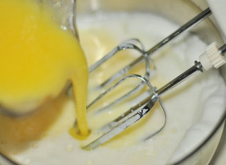 4、蛋白用打蛋器打发至细腻,加入黄桃和鱼胶片的混合液,搅拌均匀。