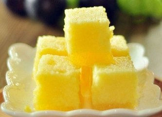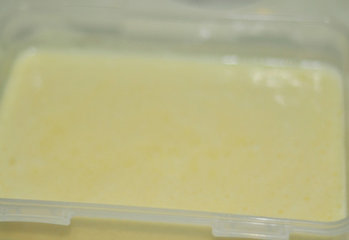 5、黄桃蛋白液,放入模具中,冰箱冷冻5个小时,即可切块食用。