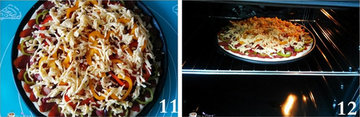 11、均匀撒上一层奶酪,然后铺上炒好的洋葱西红柿、红柿子椒、黄柿子椒、青椒,上面再均匀撒上剩下的奶酪。