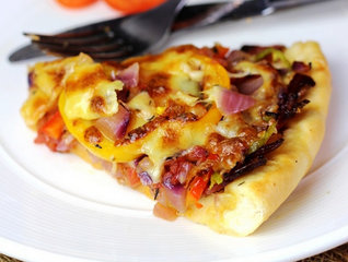 主料:高筋面粉200克,温水126克,橄榄油4克,酵母2.5克,馅料:香肠两段,培根两片,马苏里拉奶酪125克,西红柿一个,洋葱一个,红柿子椒半个,黄柿子椒半个,青椒半个