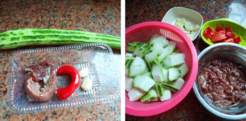 2、丝瓜去瓤切斜刀片,大蒜与红椒切片,牛肉切片后,加入盐,糖,生抽,生粉,食用油腌制。