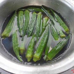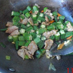 11、放秋葵煸炒,放盐 鸡精炒匀后出锅。