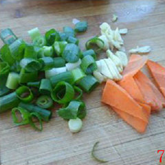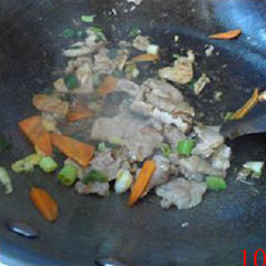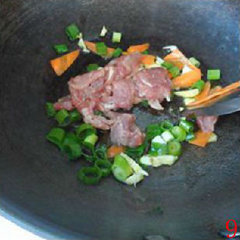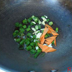 8、锅放油烧热放葱花 蒜片 胡萝卜爆锅。