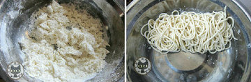 4、锅中将水烧开,下面煮至断生,捞起放入冰水中。