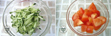 2、青瓜和番茄洗净,将青瓜刨丝、番茄切丁。