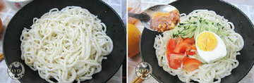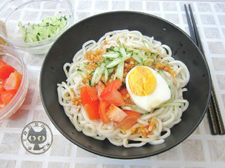 6、青瓜丝、番茄丁、鸡蛋置于面条上,淋上调匀的酱汁就可以了。