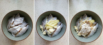 3、将裹好生粉的带鱼入空气炸锅,再将腌制过的姜丝蒜片一并码在上面,进行180度,十五分钟炸制。