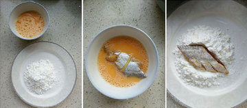 2、再备二大匙生粉,打散鸡蛋,将入好味的带鱼先过一次蛋液,再裹上一层生粉。
