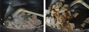 3、锅烧热放油,油热后放五花肉大火滑炒。