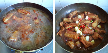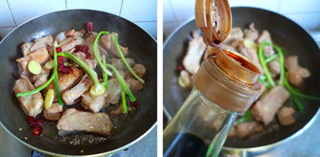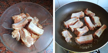 2、锅烧热,放油,下排骨煎炒至两面焦香。
