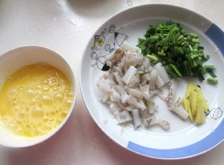 4、鱿鱼头洗净切丁,姜切丝,韭菜切碎,鸡蛋打散备用。