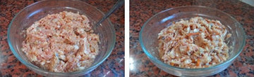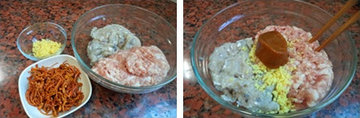1、猪肉末与鱼肉末事先剁成茸,再搅拌上劲,虫草花用的是干口,把它用清水浸泡发透,姜切碎。