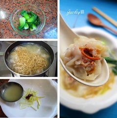 8、小锅中加入清水或清汤,并适量调味,当水开后,下面条与云吞煮熟。
