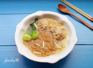 主料:猪肉末350克,鱼肉末150克,虫草花25克,姜末10克,云吞皮350克,面条150克,小油菜100克,韭黄10克