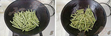 6、盖上锅盖小火将豇豆角焖至水份干颜色变深豇豆表面出现褶皱。中途要经常翻炒。