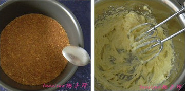 2、将消化饼干碾碎,拌入融化的黄油,拌匀。