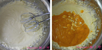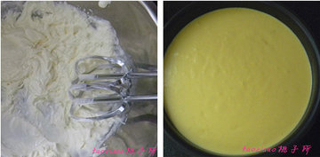 7、将淡奶油搅打出纹路,倒入芒果奶酪糊中拌匀。