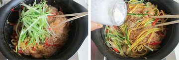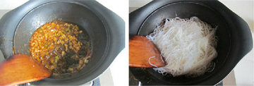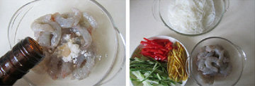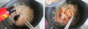 3、用虾油爆香葱姜蒜末,再下入粉丝翻炒,加入点蚝油增加鲜味;虾仁已提前炒过,不宜炒的时间太长,以便保持它的鲜嫩;而五彩丝最后加入,因为都是比较容易熟的,炒的时间太长,颜色会变。