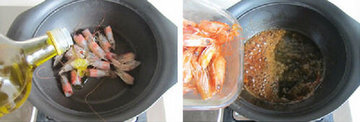 9、锅中放入虾头, 倒入适量的油翻炒。