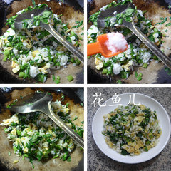 3、烧锅倒油烧热,下入蛋液翻炒成块。