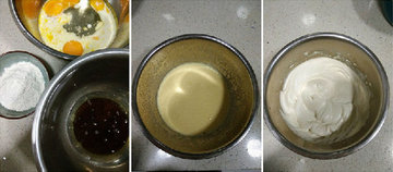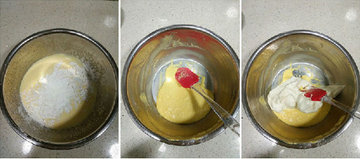 2、再将低粉加至在蛋黄糊里,拌至无干粉状,再分次将蛋白糊加至在蛋黄糊里。