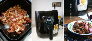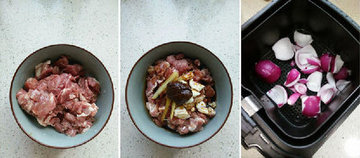 1、备好所用食材,将肉改刀,用细盐搓洗再控水,再按个人口感添加沙茶酱,酱油,姜,蒜碎,进行冰箱冷藏入味一天。再将洋葱改也码在空气炸锅里。