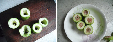 4、将肉馅装入丝瓜段中,码放在盘子上。