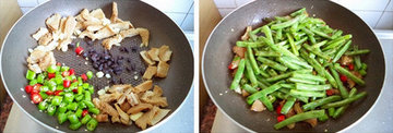 6、接着把之前煸炒过的四季豆回锅翻炒。