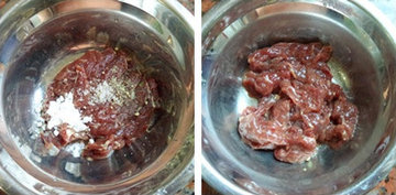 3、牛肉中加入盐,糖,胡椒粉,生粉。