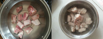 3、开火,锅内加适量水,排骨凉水下锅,煮沸,逼出血沫及脏东西,捞出。