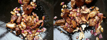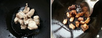 6、炒至排骨两面金黄色时,加入老抽,调色,翻匀,加入料酒(4克),翻炒。