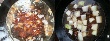 10、炖至排骨软烂时,加入冬瓜,大火炖制,冬瓜九成熟时,加入盐及糖调味,关火,盛盘。