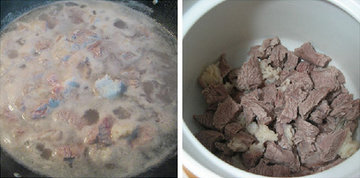 4、用筷子将焯水的肉块在锅中涮干净,然后夹出入炖锅中。