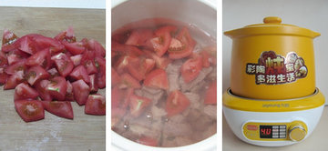 3、番茄可以留三分之一,待关火前20分钟再放入,可以保持住番茄的形状,使汤的味道更鲜,整体形象更美。