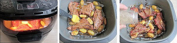 6、将空气炸锅底部铺锡纸,亚光面向上,再摆上烤架,将腌好的肉排和小土豆摆在上面。