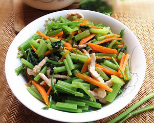 主料:芹菜200克,胡萝卜1小段,猪肉丝适量,生姜适量,大蒜1瓣