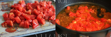 4、起油锅,加入西红柿丁,煸炒出汁,加入盐、醋、糖,翻炒数下。(看情况加水)。