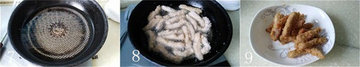8、色拉油烧至七成热,用筷子插入油锅,有冒泡。逐根放入肉条。