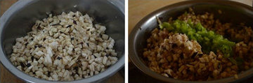 4、尖椒洗净切碎,混合到茄子丁中,加盐、生抽和一大匙花生油拌匀。