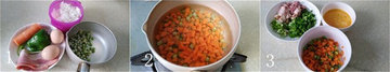 2、胡萝卜切小丁和豌豆一起焯水。米饭用微波炉稍加热。