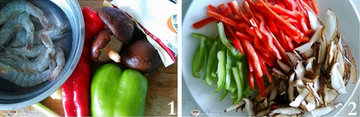 主料:青红椒各一个,虾六只,香菇三朵,土豆淀粉50克