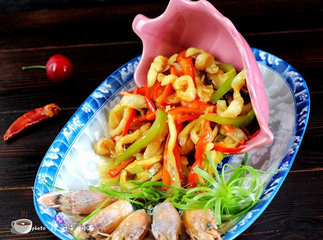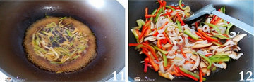 12、加入双椒丝、香菇丝,翻动均匀,变色后加入虾,香菇熟后加入水淀粉翻均匀,最后加入少许盐翻匀出锅。
