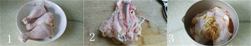 2、用剪刀从鸡腿中间沿骨头剪开,去除骨头,在带皮一面用叉子戳小洞,处理好3个鸡腿。