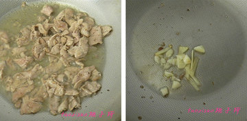 5、炒锅内放入食用油油温5成热,倒入肉片,快速用筷子划散,煸炒至肉片变色称出备用。