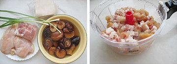 2、鸡脯肉和猪肉都切成小丁,放入多功能料理器中。
